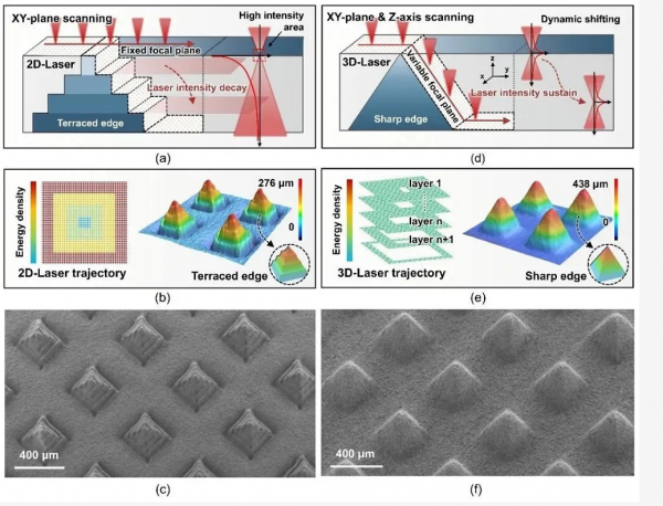 研究背景 透明柔性聚合物因其優(you) 異的光學透明性、柔韌性和生物相容性,廣泛應用於(yu) 微流控芯片、柔性電子、功能表麵和生物醫學等前沿領域。三維微結構的引入可以顯著提升其機械性能、光學特性和流體(ti) 動力學性能,從(cong) 而賦予材料一係列新功能。但由於(yu) 其柔軟、易變形、導熱性差等特性,導致加工過程中常發生彈性回彈、熱積聚、工具粘附和結構坍塌,嚴(yan) 重影響成型質量和重複性。由此可見,在聚合物材料表麵構建高精度三維微結構始終麵臨(lin) 巨大挑戰。 目前主流的模板複製法雖精度高,但流程複雜、成本高、周期長,難以滿足定製化和快速迭代的需求;3D打印和雙光子聚合等新興(xing) 方法則在分辨率、適配材料範圍等方麵仍存在權衡;傳(chuan) 統2D激光加工工藝焦平麵固定,難以應對因加工過程中焦點失配導致的能量沉積不準確的問題。因此,亟需一種兼顧精度、效率與(yu) 材料兼容性的微結構加工技術,以滿足透明柔性聚合物器件快速發展的迫切需求。 圖1 關(guan) 鍵的科學問題與(yu) 解決(jue) 方案 研究內(nei) 容 針對上述挑戰,研究團隊提出了一種通用的三維動態聚焦激光(3D-DFL)微結構製造策略。該策略通過實時調整激光焦點深度,動態補償(chang) 加工過程中因結構起伏產(chan) 生的聚焦偏移,從(cong) 而實現透明聚合物中高一致性、高保真度的三維能量沉積與(yu) 微結構製造。為(wei) 支撐3D-DFL策略的實施,建立了激光燒蝕深度預測模型,適用於(yu) 不同類型的激光與(yu) 材料。此外,還係統性研究了動態聚焦條件下的激光-材料相互作用機製,揭示了在透明介質中焦點偏移對表麵質量、加工精度的影響。研究團隊以聚合物材料聚二甲基矽氧烷(Polydimethylsiloxane,PDMS)和聚對苯二甲酸乙二醇酯(Polyethylene terephthalate,PET)為(wei) 代表性材料案例開展相關(guan) 研究。具體(ti) 內(nei) 容如下: (1)三維動態聚焦激光加工係統 本研究構建了一套三維動態聚焦激光加工係統(見圖2),采用1064 nm紅外皮秒激光,先經擴束準直,再由凹-凸透鏡組在線調節束散角,通過可調Z軸聚焦模塊實現±10 mm範圍內(nei) 的焦點實時調整。係統結合XY高速振鏡與(yu) F-Theta鏡頭,實現非接觸式、高精度三維微結構加工,具備優(you) 異的聚焦穩定性與(yu) 加工一致性。 圖2 3D動態聚焦激光加工係統與(yu) 原理:(a)係統設置示意圖;(b)動態調焦的工作原理;(c)基於(yu) 擬議激光製造裝置的三軸激光掃描係統的光路模擬結果 (2)傳(chuan) 統二維激光和三維動態聚焦激光製造方法 在透明聚合物微結構加工中,傳(chuan) 統2D激光工藝采用固定焦點,通過局部能量調控實現不同區域、不同深度的材料去除。這種方式能量分布不均,常導致邊緣呈階梯狀、結構粗糙。研究團隊對比實驗發現,盡管2D激光能實現一定的三維形貌,但需複雜能量控製,且難以避免加工瑕疵。而新提出的3D-DFL技術則通過同步調節激光焦點高度,實現每一層精準加工,保證激光能量均勻分布。與(yu) 2D激光相比,3D-DFL在構建錐形等複雜結構時展現出更高的光滑度與(yu) 幾何精度,顯微鏡圖像也證實其邊緣清晰、無缺陷,展現出顯著的加工優(you) 勢。 圖3 傳(chuan) 統2D激光和3D-DFL工藝對比:(a)固定焦平麵2D激光製造工藝示意圖;(b)2D激光加工的錐形微結構的軌跡示意圖(左)、3D視圖(右)和(c)SEM圖像;(d)3D動態聚焦激光焦平麵偏移過程示意圖;(e)3D激光製造錐形微結構軌跡(左)、3D視圖(右)和(f)SEM圖像 (3)理論模型預測精度與(yu) 製造精度 理論預測模型如式(1)所示: 式中,ω為(wei) 束腰半徑、f為(wei) 激光頻率、v為(wei) 掃描速度、d_line為(wei) 掃描線間距、P為(wei) 激光功率、F_th為(wei) 燒蝕閾值、α為(wei) 材料吸收係數、ξ為(wei) 修正係數。通過實驗獲取材料燒蝕閾值與(yu) 材料吸收係數,即可實現精準預測燒蝕深度。利用該預測模型在代表性聚合物材料PDMS和PET上進行了驗證,預測結果的平均絕對百分比誤差(MAPE)分別為(wei) 5.99%和2.68%(見圖4)。 團隊通過設計不同尺寸的金字塔結構,評估了3D動態聚焦激光加工的精度。結果表明結構高度增加會(hui) 帶來絕對誤差累積,但歸一化後,峰穀(PV值)誤差均低於(yu) 8%、均方根(RMS)誤差低於(yu) 3%,展現出優(you) 異的加工精度(見圖5)。 圖4 理論模型預測精度分析:(a-c) PDMS材料實驗結果與(yu) 預測值對比;(d-f) PET材料實驗結果與(yu) 預測值對比 圖5 製造精度誤差分析 (4)微結構製造及應用 為(wei) 驗證3D-DFL技術的靈活性與(yu) 通用性,研究團隊在具有不同材料屬性(如燒蝕閾值、吸收係數等)的聚合物基底PDMS和PET上,加工了多種類型的三維微結構,包括凸起與(yu) 凹陷結構(見圖6–8)。該實驗不僅(jin) 展示了3D-DFL在多材料體(ti) 係中的適應能力,也對工藝穩定性與(yu) 理論模型的可遷移性進行了驗證。 圖6 PDMS基底上加工凸起和凹陷的不同類型的棱錐和棱台微結構 圖7 PDMS基地上加工複雜三維微結構 圖8 PET基地上加工複雜三維微結構 為(wei) 了進一步證明所提出方法的實際可行性,展示了多個(ge) 典型微結構應用實例,涵蓋柔性傳(chuan) 感器、微流控與(yu) 功能表麵等領域(如圖9所示)。這些示例體(ti) 現了方法在實際工程場景中的可擴展性與(yu) 適應性,凸顯其產(chan) 業(ye) 應用潛力。 圖9 使用3D-DFL方法製造的微結構應用:(a-c) 壓阻式壓力傳(chuan) 感器應用;(d-f) 微流控芯片應用;(g-h) 液滴操控應用 本研究提出的3D-DFL技術為(w