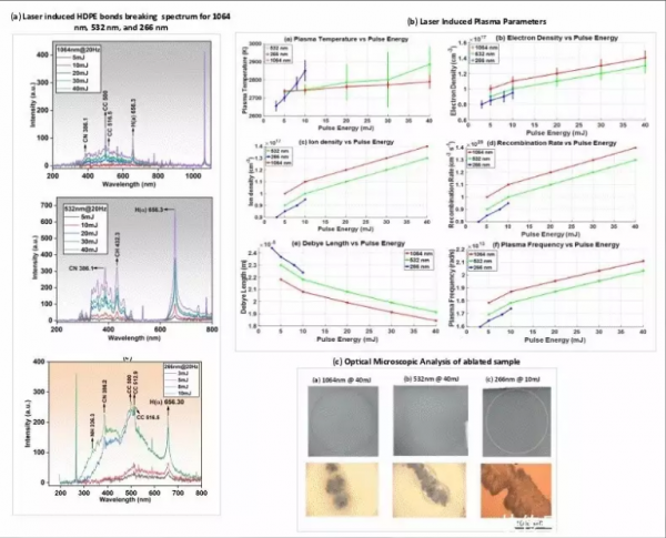 在這項工作中,研究人員采用了三種激光諧波,即1064 nm、532 nm和266 nm,以探究不同激光參數對高密度聚乙烯(HDPE)鍵斷裂的影響,並確定引發化學反應所需的能量閾值。研究結果顯示,在HDPE中引發反應所需的閾值脈衝(chong) 能量隨波長顯著變化:1064 nm時為(wei) 5-10 mJ,532 nm時為(wei) 3-5 mJ,266 nm時為(wei) 1-3 mJ。這種變化歸因於(yu) 與(yu) 各波長相關(guan) 的不同光子能量,例如,1064 nm時約為(wei) 1.17 eV,266 nm時約為(wei) 4.66 eV這直接影響它們(men) 斷裂特定分子鍵的能力,如圖1(a)所示。這些結果證實,在激光誘導熱解的背景下,每種激光波長都需要不同的閾值能量來斷裂HDPE鍵。整體(ti) 等離子體(ti) 診斷結果表明,在鍵斷裂過程中能量傳(chuan) 遞效率較高,且其他參數也支持這一觀點,如下圖1(b)所示。燒蝕部位的顯微成像進一步證實,266 nm 輻照下實現了局部、幹淨的燒蝕,而 1064 nm 和 532 nm 激光下觀察到的損傷(shang) 則更為(wei) 廣泛且模糊,如下圖1(c)所示。本研究為(wei) 激光熱解實現可持續塑料回收開辟了新途徑,有望實現更清潔、更精確的處理工藝。