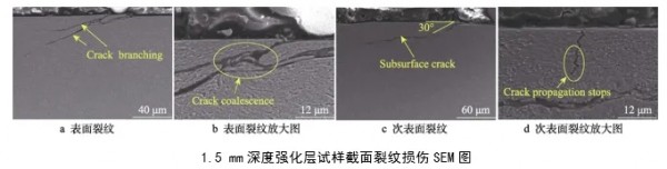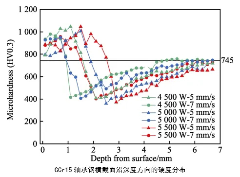 軸承是現代機械工程和設備中至關(guan) 重要的組成部分,它在航空、汽車、高速列車等行業(ye) 中發揮著重要作用。高速列車軸承的服役條件較特殊,工作時需要承受極高的轉速和相應的離心力,運行過程中會(hui) 受到衝(chong) 擊、腐蝕及高溫的作用。高速列車軸承長期受到周期交變應力的作用,其疲勞損傷(shang) 成為(wei) 其最常見的損傷(shang) 形式,通常發生在軸承的滾動體(ti) 與(yu) 滾道之間。該損傷(shang) 形式主要因為(wei) 重複的應力作用,材料逐漸疲勞,最終形成微小裂紋,這些裂紋隨著時間的推移而擴大,導致軸承失效。為(wei) 了提升高速列車軸承的使用壽命,需對其表麵進行強化處理。目前,軸承強化處理以傳(chuan) 統爐內(nei) 熱處理為(wei) 主,該種方式難以同時保障表麵的高硬度和心部的高韌性,且其能源消耗較大。激光表麵處理技術具有傳(chuan) 統方法不可比擬的優(you) 勢,可獲得比常規爐內(nei) 熱處理、感應熱處理更高的硬度,進一步提高其表麵性能,同時不會(hui) 改變心部韌性,故成為(wei) 高速列車軸承表麵性能提升的有效途徑。GCr15 軸承鋼是高速列車軸承常用的材料,其淬透性強,采用常規激光淬火技術形成的硬化層深度一般在1 mm以內(nei) ,難以滿足 GCr15 高速列車軸承深層強化的需求。本文采用深層激光固態相變技術對GCr15 軸承鋼進行表麵強化處理,以期提高GCr15軸承鋼的表麵硬度和強化層深度。通過控製工藝參數得到不同深度的強化層,並采用線接觸圓盤式滾動接觸疲勞測試裝置進行疲勞實驗,研究其疲勞損傷(shang) 機理,探討強化層深度對滾動接觸疲勞性能的影響,擬為(wei) GCr15 軸承鋼的表麵強化提供參考。