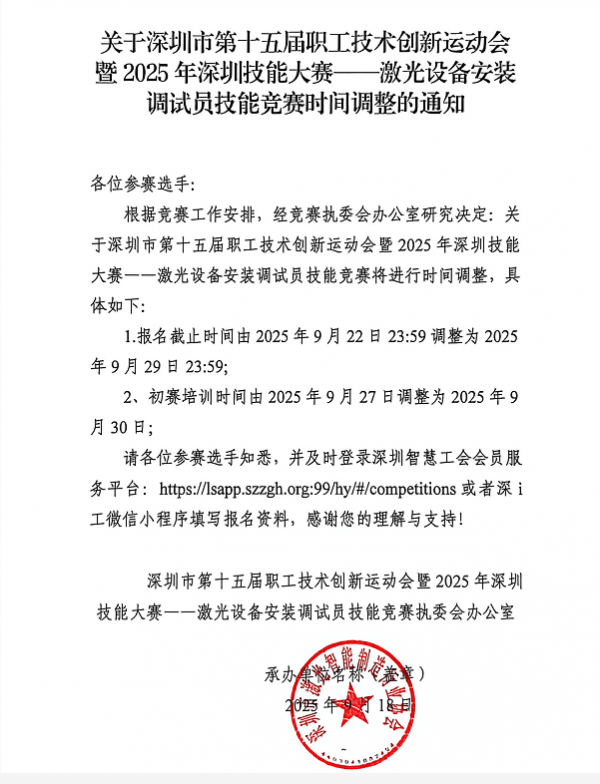 根據競賽工作安排,經激光設備安裝調試員技能競賽執委會(hui) 辦公室研究決(jue) 定,激光設備安裝調試員技能競賽時間調整,具體(ti) 如下: