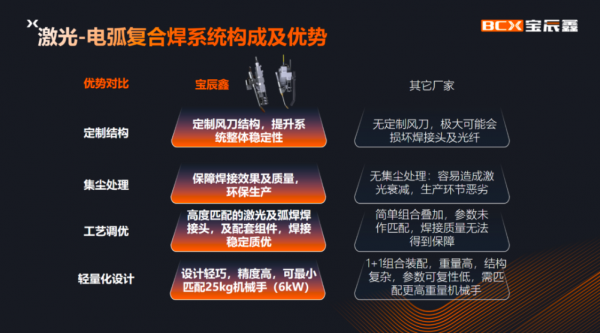 寶辰鑫重磅推出的厚板複合焊接解決(jue) 方案,為(wei) 激光-電弧複合焊接標準化解決(jue) 方案,與(yu) 市場上常見的“激光器+弧焊機+焊接頭”簡單拚湊方案不同,寶辰鑫致力於(yu) 打造即插即用、高度集成的標準化產(chan) 品。該套件的核心優(you) 勢在於(yu) 全鏈路自研與(yu) 深度優(you) 化:從(cong) 高性能的萬(wan) 瓦級核心激光器,到專(zhuan) 用的外光路配置及複合焊接槍頭組件,再到智能集成控製係統,所有關(guan) 鍵模塊均由寶辰鑫自主研發製造。