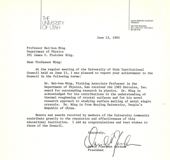 猶他大學校長戴維·加德納致閔乃本的賀信,來源丨中國科學家博物館