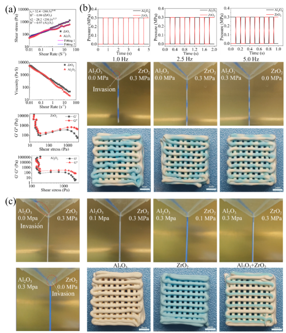 此外,研究團隊係統探究了多種陶瓷漿料的流變學特性,為(wei) 3D 打印工藝參數的科學規劃提供了關(guan) 鍵理論依據。在此基礎上,進一步針對脈衝(chong) 模式與(yu) 相對壓力控製作用下的漿料流變行為(wei) 展開深入分析。結果表明,通過優(you) 化脈衝(chong) 切換頻率並精準實施相對壓力調控,可有效抑製多材料3D 打印過程中的漿料竄流現象,為(wei) 該核心難題的解決(jue) 提供了初步技術方案。
