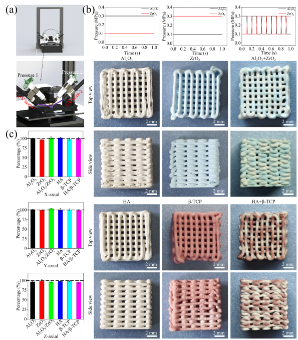 為(wei) 突破上述難題,浙江工業(ye) 大學激光先進製造研究院姚建華教授團隊提出一種集成激光輔助固化、脈衝(chong) 切換擠出與(yu) 相對壓力控製的多陶瓷DIW打印方法。其中,激光輔助固化可顯著提升成型精度,高頻脈衝(chong) 切換與(yu) 相對壓力控製協同抑製漿料竄流並提高組分切換精度。該研究不僅(jin) 為(wei) 多材料3D打印(尤其是陶瓷增材製造)領域提供了可行的技術方案,也為(wei) 相關(guan) 領域研究者提供了具有參考價(jia) 值的思路,在航空航天、醫學等高端製造場景中展現出巨大應用潛力。