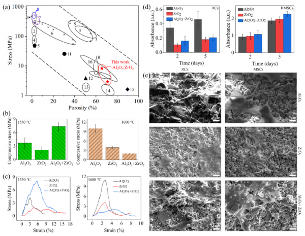 性能測試結果顯示,所製備的多陶瓷複合支架在機械性能與(yu) 生物相容性方麵,均表現出優(you) 於(yu) 單組分陶瓷支架的特性。這一結果初步證實,3D 打印多陶瓷支架在生物醫學領域(尤其是骨科植入物、齒科修複體(ti) 等精準醫療場景)具備良好的應用潛力。
