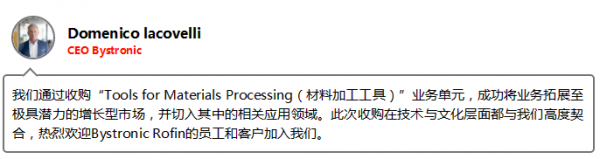 作為(wei) 百超並購戰略的重要組成部分,此次交易將讓公司獲得知名品牌羅芬(Rofin)的相關(guan) 權利,並將新收購的 “材料加工工具” 業(ye) 務整合為(wei) 全新的 “百超羅芬(Bystronic Rofin)” 業(ye) 務單元。通過這一全新業(ye) 務單元,百超將進一步豐(feng) 富激光技術應用的產(chan) 品組合,拓展高潛力增長市場中的相鄰應用領域,完善從(cong) 宏觀到微觀的全場景激光加工解決(jue) 方案。