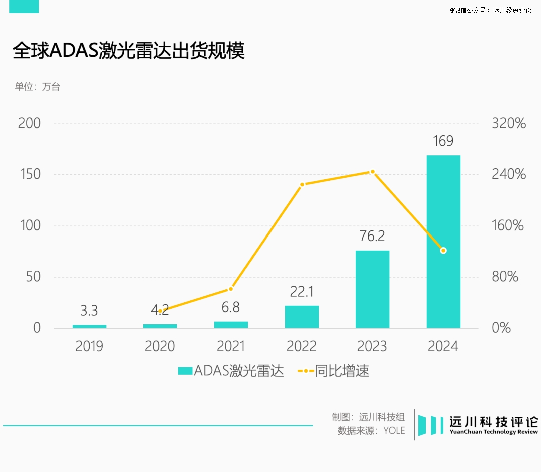 按照Yole統計[4],去年乘用車激光雷達搭載量達到169萬(wan) 台。這是什麽(me) 概念?意味著激光雷達廠商用愛發電十多年,放在9000萬(wan) 輛的全球銷量大盤裏,滲透率還不到2%。