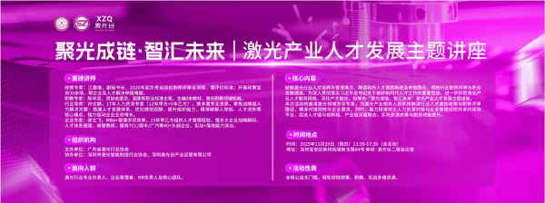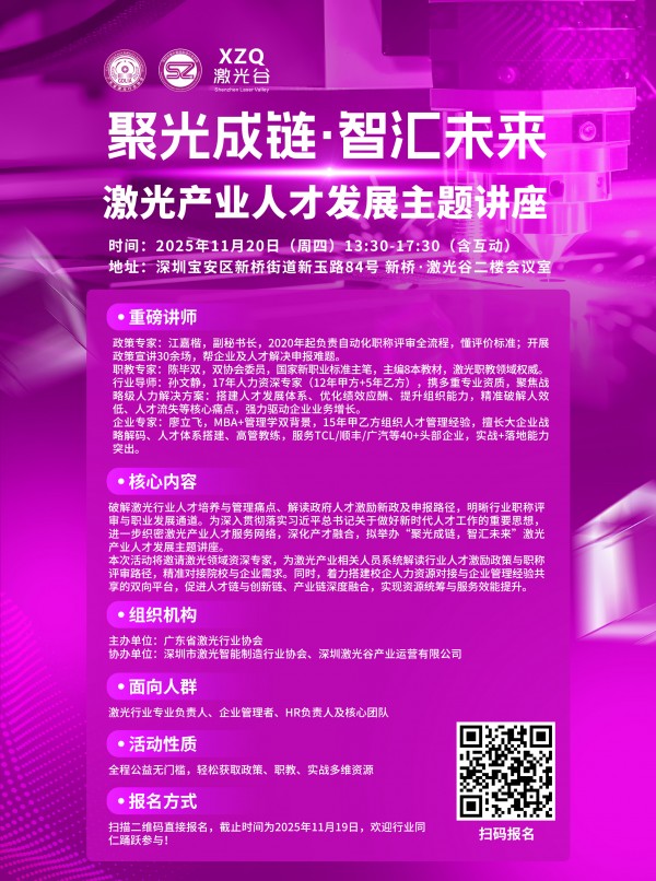 為(wei) 深入貫徹落實國家人才戰略,促進激光產(chan) 業(ye) 人才鏈、創新鏈與(yu) 產(chan) 業(ye) 鏈的深度融合,在深圳市精密儀(yi) 器與(yu) 智造激光行業(ye) 聯合黨(dang) 支部的引領下,2025年11月20日,廣東(dong) 省激光行業(ye) 協會(hui) 攜手深圳市激光智能製造行業(ye) 協會(hui) 與(yu) 深圳激光穀產(chan) 業(ye) 運營有限公司,共同舉(ju) 辦“聚光成鏈,智匯未來”激光產(chan) 業(ye) 人才發展主題講座。