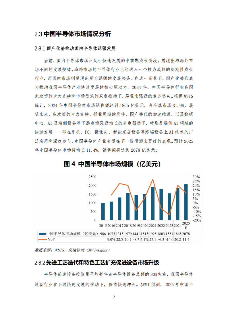 全球半導體(ti) 市場穩步增長,2024年規模達6272億(yi) 美元,2025年預計增至7280億(yi) 美元,AI算力需求成為(wei) 核心驅動力。半導體(ti) 設備市場同步升溫,2025年全球製造設備銷售額預計達1255億(yi) 美元。中國市場表現突出,2024年半導體(ti) 市場銷售額占全球31.9%,2025年預計增長至2078億(yi) 美元,半導體(ti) 設備市場規模有望達2899.3億(yi) 元,前道設備和封裝設備市場均呈增長態勢,國內(nei) 頭部晶圓廠和封測廠商積極擴產(chan) ,帶動設備需求激增。
