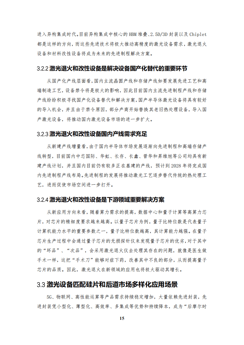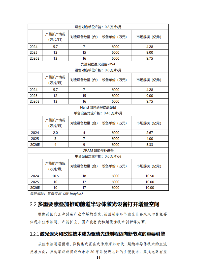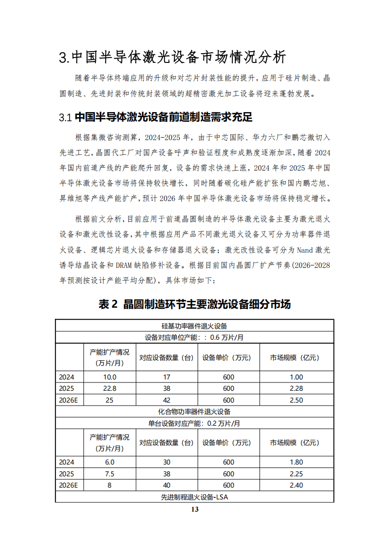 在需求推動下,中國半導體(ti) 激光設備前道市場增長強勁,2024 - 2026年各類退火設備和改性設備市場規模持續擴大。同時,先進封裝的發展帶動後道激光設備需求增長,激光劃片、打標等設備市場穩步提升。