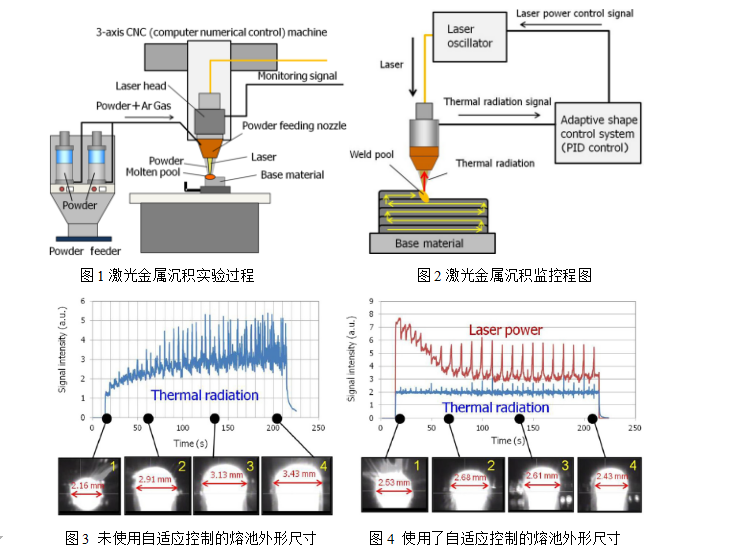 下麵介紹一個(ge) 具體(ti) 控製係統的工作過程及結果,實驗過程是一個(ge) 激光金屬沉積實驗,目的是通過控製使產(chan) 品的外形精度得到提高。圖1是一個(ge) 激光金屬沉積實驗過程圖,通過實驗可以發現產(chan) 品的外形尺寸精度與(yu) 製造過程中的熱輻射信號有很大的關(guan) 係,當熱輻射信號保持不變時,熔池的尺寸基本不變,熔池尺寸的穩定會(hui) 提高產(chan) 品外形的尺寸精度。圖2是激光金屬沉積監控過程圖,該過程使用了自適應PID控製方法,測量的得到的熱輻射信號輸入到自適應PID控製器,控製器輸出控製信號,控製信號作用到激光發射器,調節激光功率使熱輻射信號強度保持基本不變。