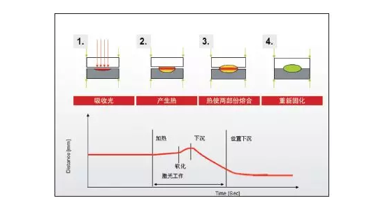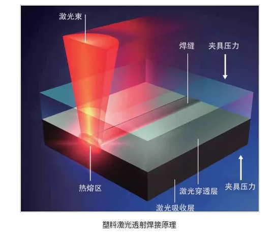 激光焊接是利用高能量密度的激光束作為(wei) 熱源的一種焊接方法,即激光輻射加熱工件表麵,表麵熱量通過熱傳(chuan) 導向內(nei) 部擴散,使工件熔化,形成特定的熔池。如下圖所示,激光束通過上層透光材料,然後被下層材料吸收,激光能量被吸收後轉換為(wei) 熱能,由於(yu) 兩(liang) 層材料被壓在一起,熱能從(cong) 吸收層傳(chuan) 導到透光層上,使得兩(liang) 層材料熔化並結合。