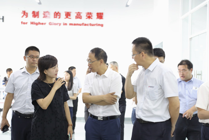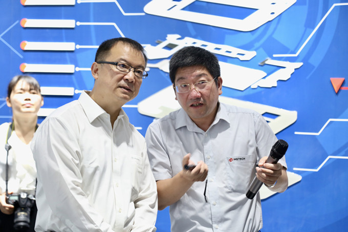 華工激光總經理鄧家科(右)為(wei) 青羊區區長詹慶講解