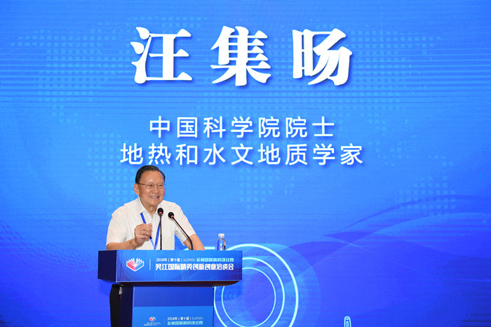 中國科學院院士、地熱和水文地質學家汪集暘先生致辭。已過80高齡的汪院士是吳江籍人士,他回憶了從吳江出生,後來走出吳江求學,多年在外工作的人生曆程,表達了自己對家鄉的感情,他認為吳江自古人傑地靈,是可以有大作為的地方。
