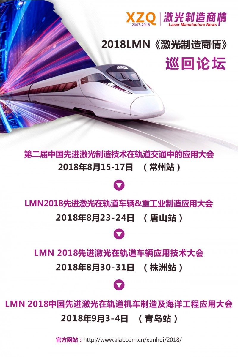 由fun88官网平台產業社團聯盟、唐山市科學技術局、廣東省激光行業協會主辦,中國科學院唐山高新技術研究與轉化中心、深圳市激光智能製造行業協會、激光製造商情承辦的“LMN2018先進激光在軌道車輛&重工業製造應用大會”,將於:2018年8月23-24日在唐山舉辦。會議圍繞智能激光在軌道交通製造行業中的應用及挑戰,激光綜合解決方案在工業製造行業中的應用,高功率激光在冶金、礦產行業中的應用進行專題研究。中國科學院姚建銓院士、哈爾濱工業大學國防科技工業焊接自動化中心雷正龍副主任、中國科學院力學研究所激光毛化中心李正陽教授…等專家將出席會議,並做精彩演講!