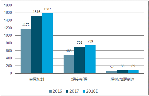2016-2018年大功率激光加工應用領域(單位:百萬(wan) 美元)