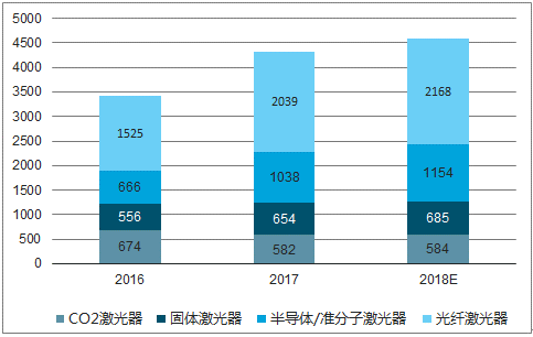 2016-2018年工業(ye) 激光市場規模(單位:百萬(wan) 美元)