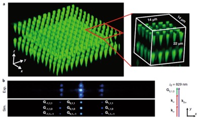 中國科學技術大學與南京大學的研究團隊合作發展出一種全新的電疇控製技術:利用聚焦飛秒激光在铌酸鋰晶體內部實現鐵電疇(二階非線性光學係數)的定點擦除,實現了二階非線性光學係數在三維空間的調製。在製備結構的過程中,吳東教授團隊提出了不同層能量補償加工技術,保證了三維結構的整體均一性。經過兩年多時間的摸索,在铌酸鋰晶體中成功製備出了四方結構的三維非線性光子晶體,光子晶體的三維周期結構參數為3 μm (x) × 3 μm (y) × 11 μm (z)。南大研究團隊在後續實驗上成功觀察到了預期的三維準相位匹配倍頻效應,100 μm光程的共線倍頻轉換效率達到了10^-4, 該值與理論估算相一致。三維非線性光子晶體研製成功為研究三維空間的非線性光學和量子光學研究提供了一種新材料, 也為三維微納光子器件的發展提供了支撐。實際上三維非線性光子晶體中調製的不僅有二階非線性光學係數,由於鐵電晶體中壓電係數、電光係數、熱電係數等所有奇數階物性張量都是隨電疇調製的,也形成了三維空間分布,可以預見,更多的新的光、聲及其耦合效應將會從這種新材料中被陸續揭示出來。