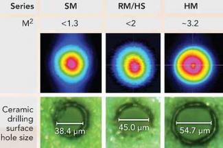 在SPI公司,我們(men) 已經開發了一係列脈衝(chong) 激光器,可以廣泛用於(yu) 標稱需要不同光束質量的應用(見圖2)。激光器光束質量的影響極為(wei) 顯著,主要與(yu) 產(chan) 生的聚焦斑點尺寸相關(guan) 。對比研究則顯示出斑點尺寸對於(yu) 標刻和鑽孔加工應用的影響。當激光脈衝(chong) 數量相同時,單模脈衝(chong) 激光器可以產(chan) 生窄深的高深寬比的孔,而更高模式的激光器則產(chan) 生漸寬漸淺的孔。這一結果或許在多數情況下有效,不過要指出的是,最終特征不必嚴(yan) 格與(yu) 估算的斑點尺寸一致,這應該視應用的要求而定。
