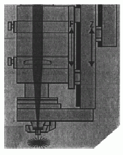 (2)在切割頭上增加一獨立的移動透鏡的下軸,它與(yu) 控製噴嘴到材料表麵距離(stand off)的Z軸是兩(liang) 個(ge) 相互獨立的部分。當機床工作台移動或光軸移動時,光束從(cong) 近端到遠端F軸也同時移動,使光束聚焦後光斑直徑在整個(ge) 加工區域內(nei) 保持一致。(如圖1)