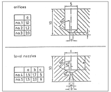 對於(yu) 不同的氣體(ti) 有不同的壓力閾值,當噴嘴壓力超過此值時,氣流為(wei) 正常斜激波,氣流速從(cong) 亞(ya) 音速向超音速過渡。此閾值與(yu) Pn、Pa比值及氣體(ti) 分子的自由度(n)兩(liang) 因素有關(guan) :如氧氣、空氣的n=5,因此其閾值Pn=1bar×(1.2)3.5=1.89bar。當噴嘴壓力更高Pn/Pa=(1+1/n)1+n/2時(Pn>4bar),氣流正常斜激波封變為(wei) 正激波,切割壓力Pc下降,氣流速度減低,並在工件表麵形成渦流,削弱了氣流去除熔融材料的作用,影響了切割速度。因此采用錐孔帶端部小圓孔的噴嘴,其氧氣的噴嘴壓力常在3bar以下。