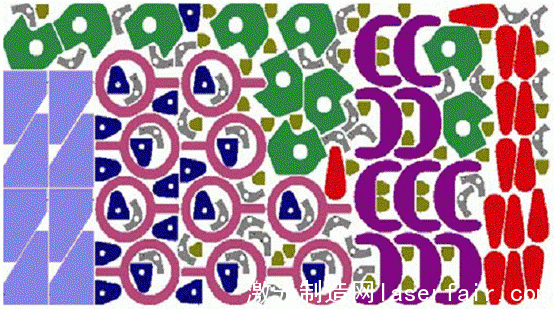 光纖激光切割非常適於(yu) 高效的排樣組件的切割,典型的排樣切割如圖6所示。由於(yu) 其切縫窄和較小的熱影響區,工件能緊密地排列在一起,甚至是連接在一起。使用排樣法時,光纖激光係統相比於(yu) 高精度等離子切割能節省15%的板材,使製造商從(cong) 高效、節能、實用的激光加工(laser oem)係統中獲益。
