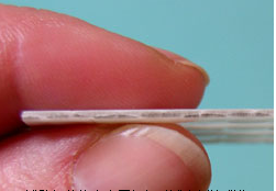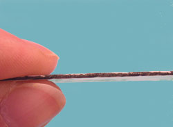 板材樣品如第二幅圖所示,它是由滌綸織物和聚酯薄板粘合而成。此塊樣品的厚度為0.38mm (0.015”),切割速度為19米每分(750 IPM),激光器功率為100W。在使用200W的功率時,切割速度可達38.1米每分(1500 IPM)。同樣地,樣品切邊幹淨平整無變色。