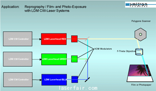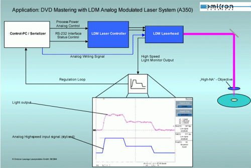 該激光模塊通過模擬調製,可以取代傳統氣體激光器必須依靠聲光 調製器來實現CD/DVD刻寫。 例如LDM405. 55. A350就是該應用的理想光源。LDM激光器的調製範圍和精度完全可以和聲光調製器的性能相比。 另外,LDM405. xx. A350 所配備的調製輸入接口與聲光調製器接口兼容,因此如果從現有的傳統激光加聲光調製設備升級的話無需任何擴展接口。 | ||||||||||||||||