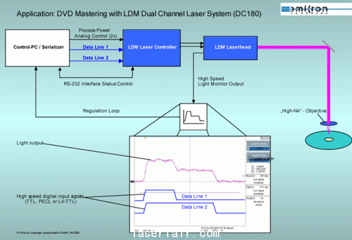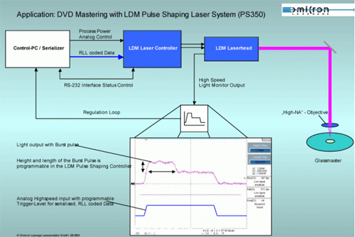 DVD 刻寫需要的是最高質量的藍紫光半導體激光器。 光束質量越高,波前誤差就越小,聚焦能力才可能達到所需的250nm或者更小。 DVD刻寫即激光對光盤表麵的感光材料或者光致抗蝕材料進行曝光。Omicron已經研發出了一整套的LDM激光二極管用於這個應用。控製器型號為 A350, PS350 and DC180 的激光都可以用於CD/DVD mastering。其最高功率超過100mW,模擬或數字調製能力可達350 MHz/500MHz。 | ||||||||||||||||