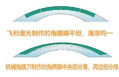 ①用飛秒激光製作的角膜瓣不會(hui) 出現紐扣瓣、遊離、破碎等情況,角膜瓣厚度各處相同,均勻一致;而微型角膜刀製作的角膜瓣一般都存在周邊部稍厚,中央部較薄的情況,很難做到中央部與(yu) 周邊部厚度一樣的板層角膜瓣,因此角膜刀切瓣的術後複位固著性不好。