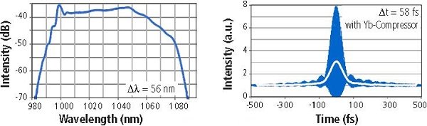 我們(men) 以Menlosystems公司摻Yb光纖激光器(中心波長1030nm)很為(wei) 例,在鎖模狀態下,擁有56nm的寬光譜(FWHM)和58fs的脈衝(chong) 寬度。這使其將獲得更強的色散和非線性效應,從(cong) 而通過非線性光纖能夠獲得更大的光譜展寬。