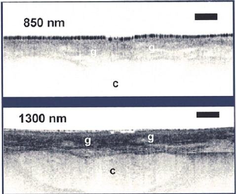 第一,人體(ti) 細胞對850nm以下的光,有較強的散射,而細胞中的水份對1500nm以上的光,吸收率又較高,這兩(liang) 點都對OCT的應用極其不利,因此,通常OCT的光源都要求波長在850-1600nm之間。圖3分別顯示了850nm和1300nm下的喉部軟骨組織OCT影像。1300nm下的圖象明顯更清晰。#p#分頁標題#e#
