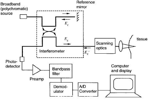 OCT的基本原理如圖2所示,基本功能部分為(wei) 2Х2的WDM,將檢測光和參考光都輸入光纖,並在光纖耦合器中分成2部 分,一部分進入參考臂,一部分進入采樣臂。當參考臂上反射回來的光和采樣臂上反射回來的光進行幹涉的時候,在幹涉臂探測器上將獲得最強信號。然後對不同空 間點的采樣,就可以獲得不同空間的信息。經過濾波,數模轉換等處理,將該信息轉換成可視頻顯示的圖象。因此,光是信號載波,光信號和最終的獲得的信息是相 關(guan) 聯的,光源的選擇對OCT的性能有重大影響。