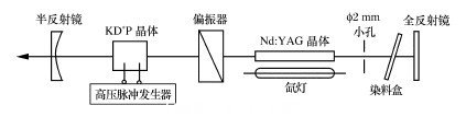 染料溶液層厚 0.8mm,2m m的小孔用來選橫模。腔內(nei) 加入電光開關(guan) 、KD* P 晶體(ti) 、偏振器