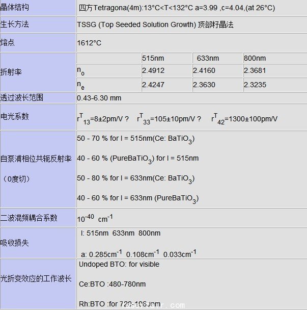 北京物科光電技術有限公司擁有對BaTiO3單晶十餘(yu) 年的研發經驗。為(wei) 了擴展其光折變效應的工作波段,近年來先後開發出摻鈰(Ce)、銠(Rh)等鈦酸鋇單晶以及多種規格的BaTiO3基片。其中Ce:BaTiO3獲有美、中兩(liang) 國發明專(zhuan) 利權。