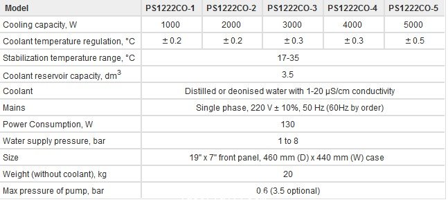 COOLING UNIT PS1222CO is designed for flashlamp-pumped lasers and provides effective heat removal and high stability of laser rod temperature. This enables long term operation of your laser at maximum efficiency. Unit is assembled in 19" chase and may be used completing the powering group of laser systems. Also it can be mounted into the 19'' rack.