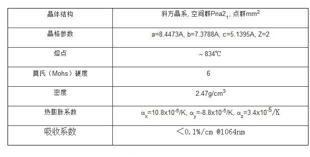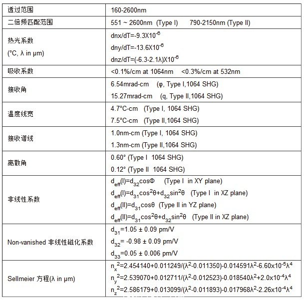 u對2W鎖模鈦寶石激光(<2ps, 82MHz)倍頻可輸出功率大於(yu) 480mW的395nm波長激光,利用5x3x8 mm3 尺寸的LBO晶體(ti) 可獲得的波長範圍在700-900nm。 u使用9mm LBO晶體(ti) 的泵浦Nd:YLF激光(>500μJ @1047nm,<7ns, 0-10KHz)倍頻轉換率大於(yu) 40%。 u利用LBO晶體(ti) 和頻效應可獲得187.7nm波長的真空紫外光。 u對調Q Nd:YAG激光進行腔內(nei) 三倍頻可獲得輸出脈衝(chong) 能量2mJ的衍射極限光束。 LBO晶體(ti) 的物化特性: