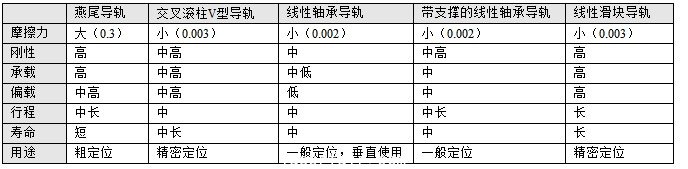 電機控製的電動平移台(電控位移台)因為(wei) 可以進行電路細分,分辨率可以達到超微米級,還可通過計算機控製,達到自動化目的。電動平移台多采用滾珠絲(si) 杠傳(chuan) 動,可循環的線性軸承或線性滑塊做導軌,所以行程可以很大,可到1米,負載可到50kg(慢速還可提高),精度也可達到微米級,但價(jia) 格偏貴。下表對常用導軌作了比較: