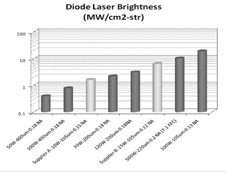 圖2.二極管激光器亮度(MW/cm2-str)為(wei) 各種各樣的二極管激光器模塊。亮度超過18MW / cm2-str已經達到了使用nLIGHT的PearlTM生產(chan) 線的水平。