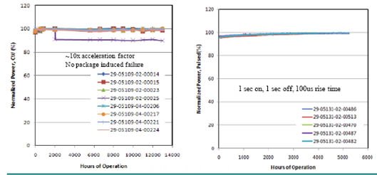 為(wei) 測量這些包裝的可靠性進行了,九個(ge) 模塊在10x加速度條件下被測量(加速高溫和功率運作)。 而激光激光器包裝測量的FIT率(1200FIT)和二極管激光器在終身測試套上所測試的FIT率(1150)相匹配,顯示出了缺乏包裝故障率 (PIF)。這些設備的性能lifetest如下圖,如圖4。模塊失敗在輸出功率方麵被描述為(wei) 20%的退化(或相應增加20% 偏置電流),在給定的加速因素下而激光激光器相當於(yu) 超過75000小時的操作下沒有模塊故障。類似包裝運行在硬脈衝(chong) 條件下,以 20ms上升下降。