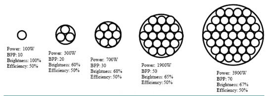 圖7 .功率和1,3,7,19和39元素光纖包捆闡述。由此可見,大約65%的亮度當使用光纖包捆時被保存。剩餘(yu) 亮度的損失可能歸因於(yu) 間於(yu) 光纖之間的間隙空間,以及熔覆層的厚度。注意到效率值大約為(wei) 50%實現了功率水平,證明方法不失規模力量效率。