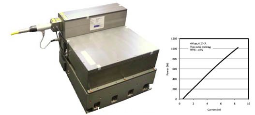 圖6 .(左)一個(ge) KW-class二極管激光器係統以單一輻射源為(wei) 基礎。該裝置利用波長光束組合達到1000 W的輸出功率為(wei) 400微米,0.2MA的光纖。(右)模塊的光與(yu) 電流曲線。