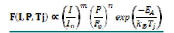 為(wei) 評估一個(ge) 新的3.8mm腔長二極管的可靠性,一直在進行中的多元壽命測試試驗長達3000小時來決(jue) 定溫度、電流,功率加速因素,以及可靠運行條件。 一個(ge) 隨機故障加速模型可以用以下模型來表述,其中突然失效F由二極管電流I加速引起,光輸出功率P和接點溫度Tj: