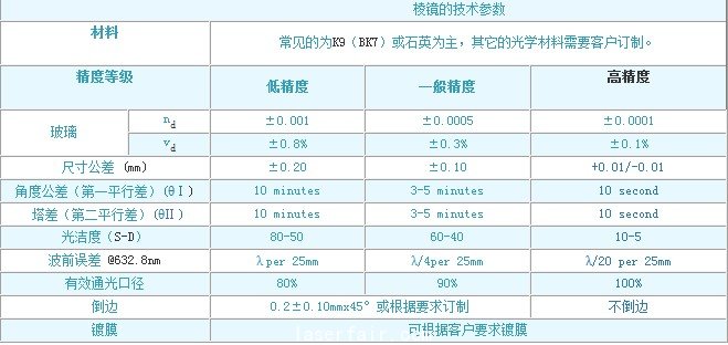 炬科光學能提供各種高精度的棱鏡。各種棱鏡的技術參數: