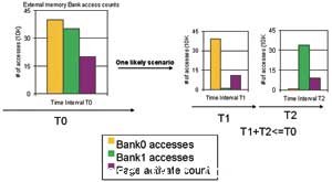 為(wei) 了說明這一點,考慮這樣一個(ge) 情況,總線在時間區間T的活動表明,對所有組的訪問是均衡的,但離頁訪問比例較高,但在較小時間區間(T1、T2,其中T1+T2=T)中記錄的總線活動表明對各組的訪問是不均衡的,見圖2。如果緩存布局可對時間區間T1和T2分別進行優(you) 化,則有可能顯著改善係統性能。