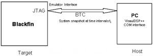 Blackfin處理器使用一個(ge) 通用定時器定期地產(chan) 生中斷。在定時器發出中斷時,指標寄存器的內(nei) 容被讀出並存儲(chu) 在存儲(chu) 器中。在主機發出請求時,存儲(chu) 的指標寄存器數據通過BTC通道發送到PC。BTC通道支持數據傳(chuan) 輸速率高達3Mbps。