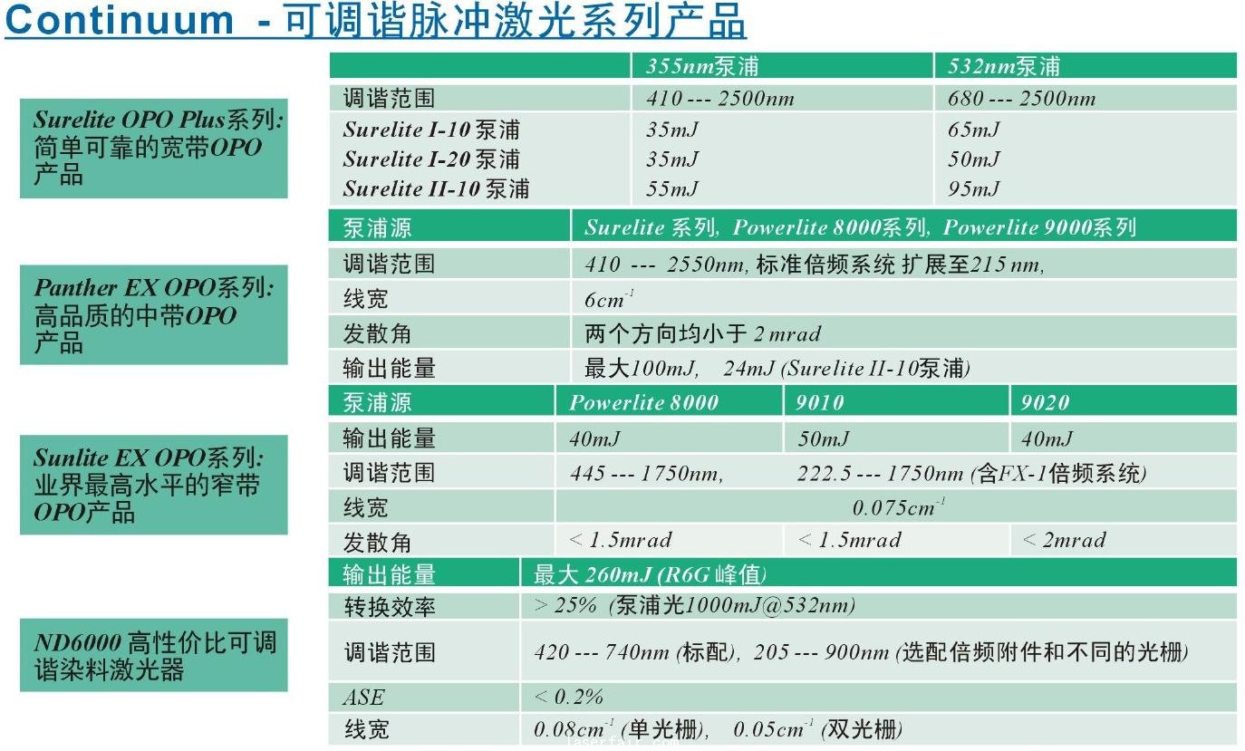 Continuum是世界知名的專(zhuan) 業(ye) 激光器生產(chan) 廠商,隸屬於(yu) NASDAQ上市公司GSI集團,它致力於(yu) 生產(chan) 閃光燈泵浦的高能量脈衝(chong) 固體(ti) 激光器、光參量振蕩器(OPO)、可調諧染料激光器、TW/PW泵浦源等激光器產(chan) 品。自1975年創立以來,Continuum一直致力於(yu) 技術創新和產(chan) 品生產(chan) 工藝的革新,具備了強大的研發和工業(ye) 化生產(chan) 能力,並且通過了ISO9001 & EN46001、FDA SR、Medical Device等多項認證。近年來相繼推出的Agilite 脈寬可調型YAG激光器、Intrepid型OPCPA泵浦源和Powerlite DLS係列計算機控製的脈衝(chong) YAG激光器更是業(ye) 界的標杆產(chan) 品。 自八十年代中期始,Continuum以成功中標世界銀行貸款項目為(wei) 標誌,開始大量進入中國市場。目前國內(nei) 的擁有量已超過270台,用戶遍及30個(ge) 省市自治區和港澳特別行政區,包括:清華大學、北京大學等著名學府、近30個(ge) 國家實驗室和國家重點實驗室、中科院各研究所、中科院光電研究院等科研院所以及上海寶山鋼鐵等知名企業(ye) 。 從(cong) 寬帶Surelite OPO plus 到中帶Panther EX OPO 到獨有的窄帶Sunlite EX OPO, Continuum提供全係列光學參量振蕩器(OPO)產(chan) 品。對應紫外可見波段的用戶,還有超低熒光的脈衝(chong) 染料激光器可供選擇。