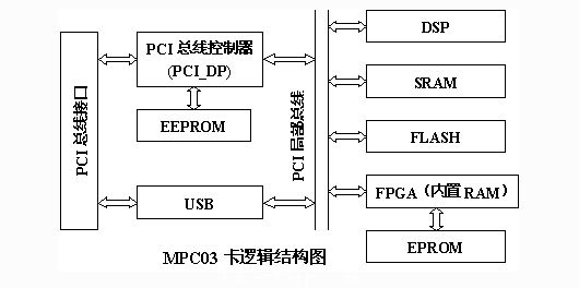 1.MPC03卡電路設計在MPC03卡中主要有DSP、FPGA兩(liang) 個(ge) 功能芯片,在DSP周圍擴展了多個(ge) FLASH和SRAM來存儲(chu) 程序和數據,每兩(liang) 個(ge) FLASH和SRAM可以共用一個(ge) 片選信號CS,組成高低雙字32位數據總線進行讀寫(xie) ,可以提高DSP與(yu) MEMORY的通信速度,同時為(wei) FPGA配置了一個(ge) EPROM來存儲(chu) 下載的程序。連接DSP局部總線和PCI接口的芯片是PCI總線控製器(PCI橋),它包含了一個(ge) 128KBit的雙口共享存儲(chu) 器,來實現DSP局部總線和PCI係統總線的數據交換,另外為(wei) 其配置了一個(ge) EEPROM來存儲(chu) 數據,同時本卡順應了即插即用接口設計趨勢,擴展了USB接口。本文提到的DSP和FPGA都是低能耗、低電壓操作,I/O信號電壓是3.3V,而內(nei) 核電壓是1.8V,所以配置了能同時輸出3.3V和1.8V兩(liang) 種電壓的電壓調整器。請參照MPC03卡邏輯結構圖。