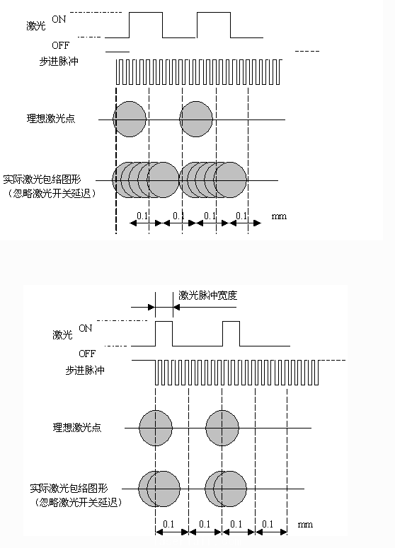 舉(ju) 例分析:假設位圖數據為(wei) 1010,光斑直徑為(wei) Ф0.1mm,單像素脈衝(chong) 數5,則步進脈衝(chong) 和激光掃描如下: