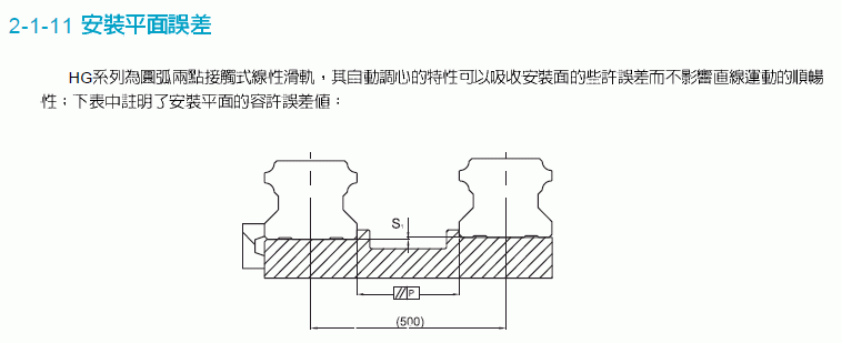 來自圓弧溝槽的DF(45°-45°)組合,在安裝的時候,皆由鋼珠的彈性變形及接觸點的轉移,即使安裝麵多少有些偏差,也能被線軌滑塊內(nei) 部吸收,產(chan) 生自動調心能力之效果而得到高精度穩定的平滑運動。